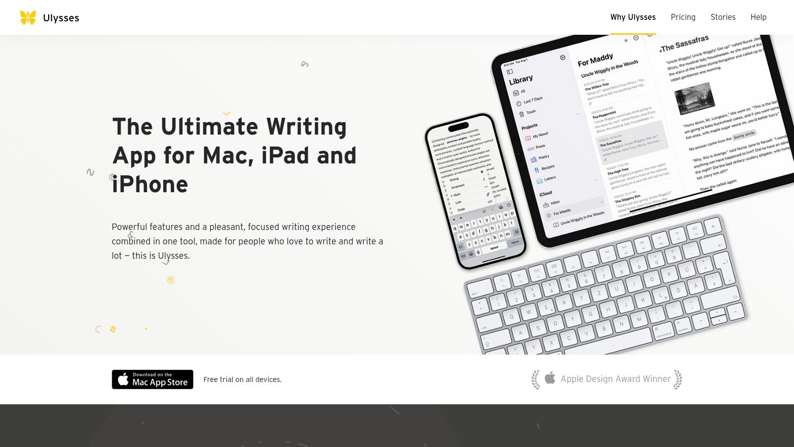 | Ulysses | Minimalist Markdown editor; sync across Apple devices | Clean UI; distraction-free; solid export options | $5.99/mo or $49.99/yr | Creative & professional Mac/iOS writers | Seamless device sync; Markdown focus |