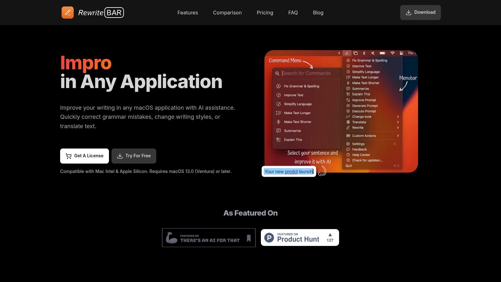 RewriteBar is a powerful AI-powered writing assistant specifically designed for macOS that streamlines your writing process directly within any application. For Mac users seeking enhanced writing without the constant disruption of copying and pasting between apps, RewriteBar offers a game-changer. It provides on-the-spot grammar and spelling corrections, tone adjustments, style transformations, text summarization, and even multilingual translation, all accessible through a simple, customizable keyboard shortcut. This makes it an ideal mac software for writing for various user groups, including non-native English speakers, developers crafting documentation, marketers refining copy, students polishing essays, and entrepreneurs composing impactful emails.